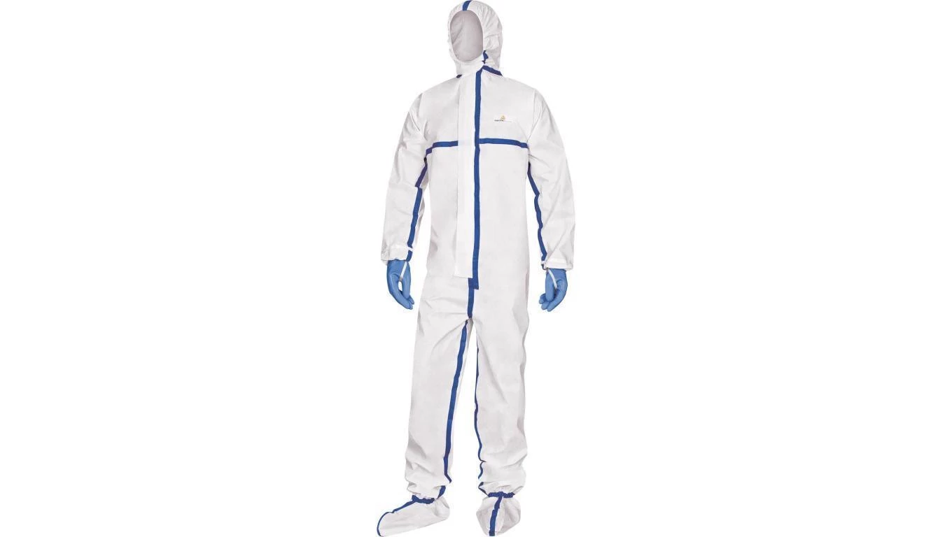 Kombinezon z kapturem oraz ochroną stóp z uszczelnionymi szwami biały XL o numerze katalogowym DT250XG w kategorii Kombinezony, Odzież robocza. Produkt wyprodukowany przez markę DELTA PLUS.