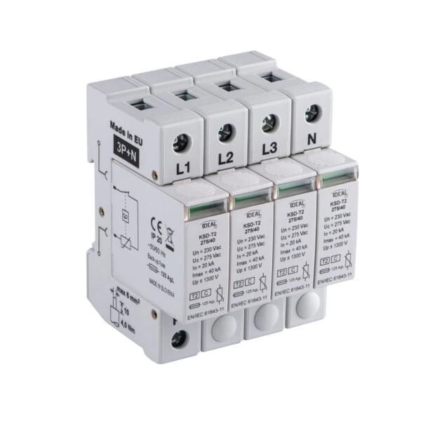 Ogranicznik przepięć KSD-T2 275/160 3P+N o numerze katalogowym   23133 w kategorii Ograniczniki przepięć>Ograniczniki przepięć typ 2. Produkt wyprodukowany przez markę IDEAL.