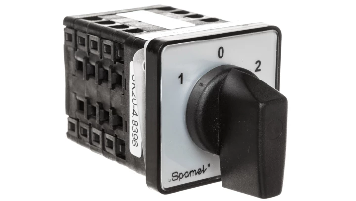 Łącznik Krzywkowy 20A, Rozłącznik 1-0-2 (4 - biegunowy), mocowany do pulpitu czoło szare pokrętło czarne o numerze katalogowym SK20-4.8396\P03 w kategorii Wyłączniki i rozłączniki obrotowe, Wyłączniki, rozłączniki. Produkt wyprodukowany przez markę SPAMEL.