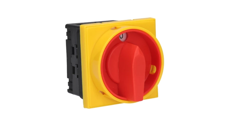 ŁĄCZNIK KRZYWKOWY 25A, ROZŁĄCZNIK 0-1 (2 - BIEGUNOWY), MOCOWANIE DO PULPITU CZOŁO ZAMYKANE ŻÓŁTO/CZE