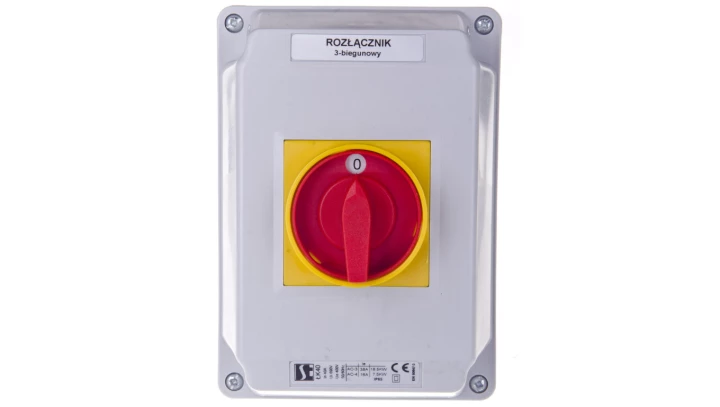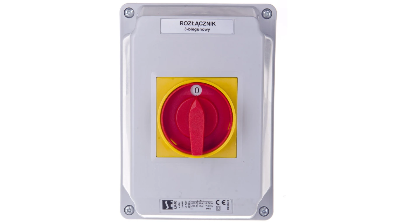 Łącznik Krzywkowy 40A, Rozłącznik 0-1 (3 - biegunowy), w obudowie OB4 z czołem zamykanym żółto/czerwonym o numerze katalogowym ŁK40-2.8211\OB4ZC w kategorii Wyłączniki i rozłączniki obrotowe, Wyłączniki, rozłączniki. Produkt wyprodukowany przez markę SPAMEL.
