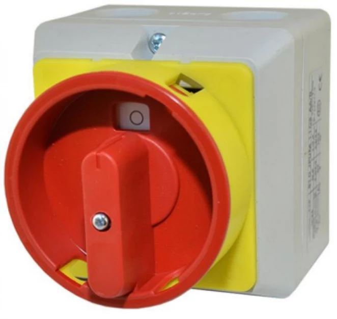 Łącznik krzywkowy w obudowie z tworzywa z możliwością zamknięcia na 3 kłódki (5-8mm), czerwone pokrętło, 0-I (załącz - wyłącz), 25A, 3 polowy, IP65 TK-Ł S25JPUM1103 A6R o numerze katalogowym TK-Ł S25JPUM1103 A6R w kategorii Mikroprzełączniki, Czujniki mechaniczne. Produkt wyprodukowany przez markę PROMET.