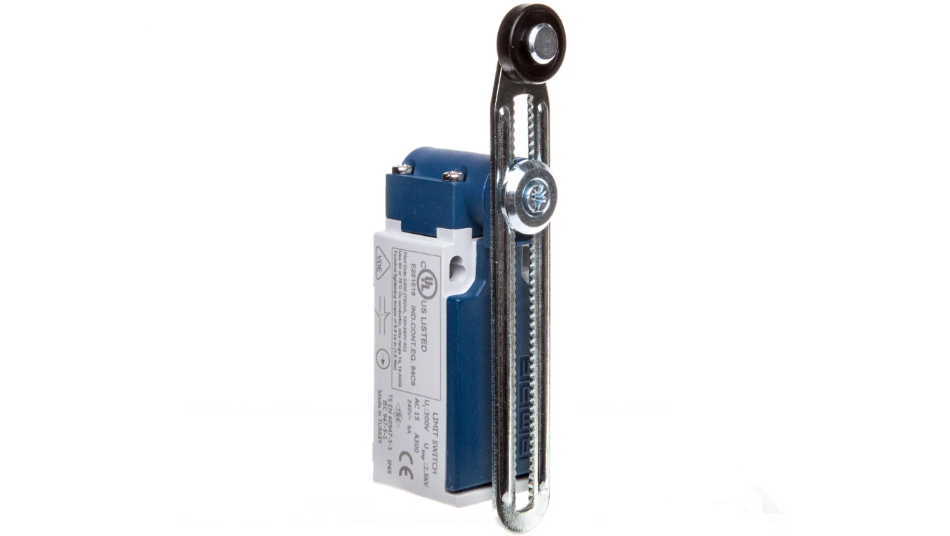 ŁĄCZNIK L5 W OBUDOWIE Z TWORZYWA, 1NC+1NO, DŁUGA METALOWA DŹWIGNIA Z ROLKĄ TWORZYWOWĄ EMAS