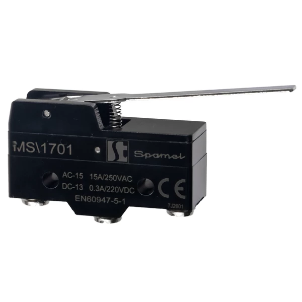 Łącznik miniaturowy dźwignia płaska długa o numerze katalogowym MS\1701 w kategorii Krańcówki, Czujniki mechaniczne. Produkt wyprodukowany przez markę SPAMEL, seria MS.