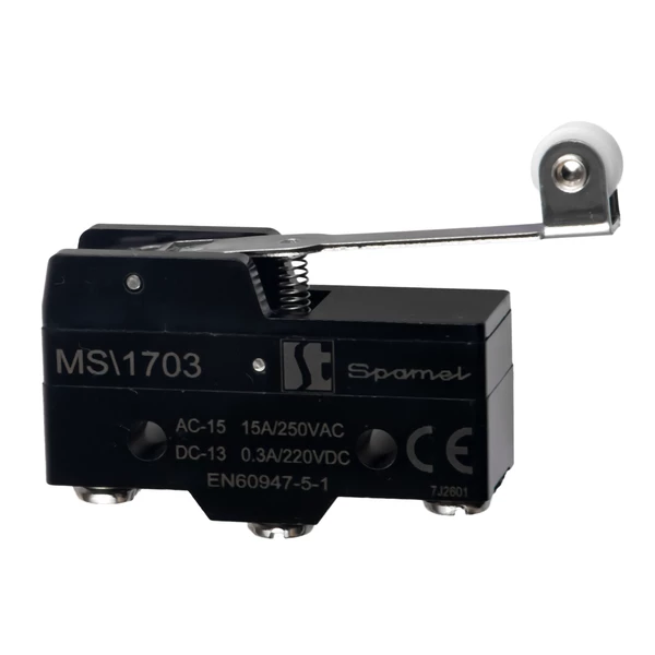 Łącznik miniaturowy dźwignia z rolką długa o numerze katalogowym MS\1703 w kategorii Krańcówki, Czujniki mechaniczne. Produkt wyprodukowany przez markę SPAMEL, seria MS.
