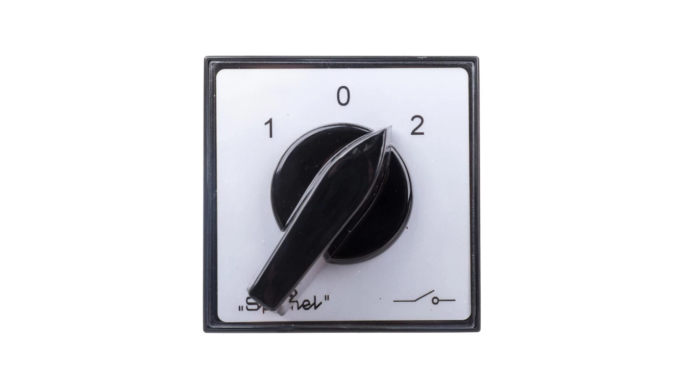 Łącznik Krzywkowy 15A, Rozłącznik 1-0-2 (2 - biegunowy), mocowany do pulpitu czoło szare pokrętło czarne o numerze katalogowym ŁK15-2.8338\P03 w kategorii Wyłączniki i rozłączniki obrotowe, Wyłączniki, rozłączniki. Produkt wyprodukowany przez markę SPAMEL.