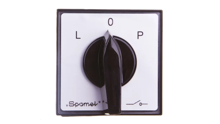 Łącznik krzywkowy 15A, przełącznik zmiany kierunku obrotów L-0-P, mocowany do pulpitu czoło szare pokrętło czarne o numerze katalogowym ŁK15-3.8368\P03 w kategorii Wyłączniki i rozłączniki obrotowe, Wyłączniki, rozłączniki. Produkt wyprodukowany przez markę SPAMEL.