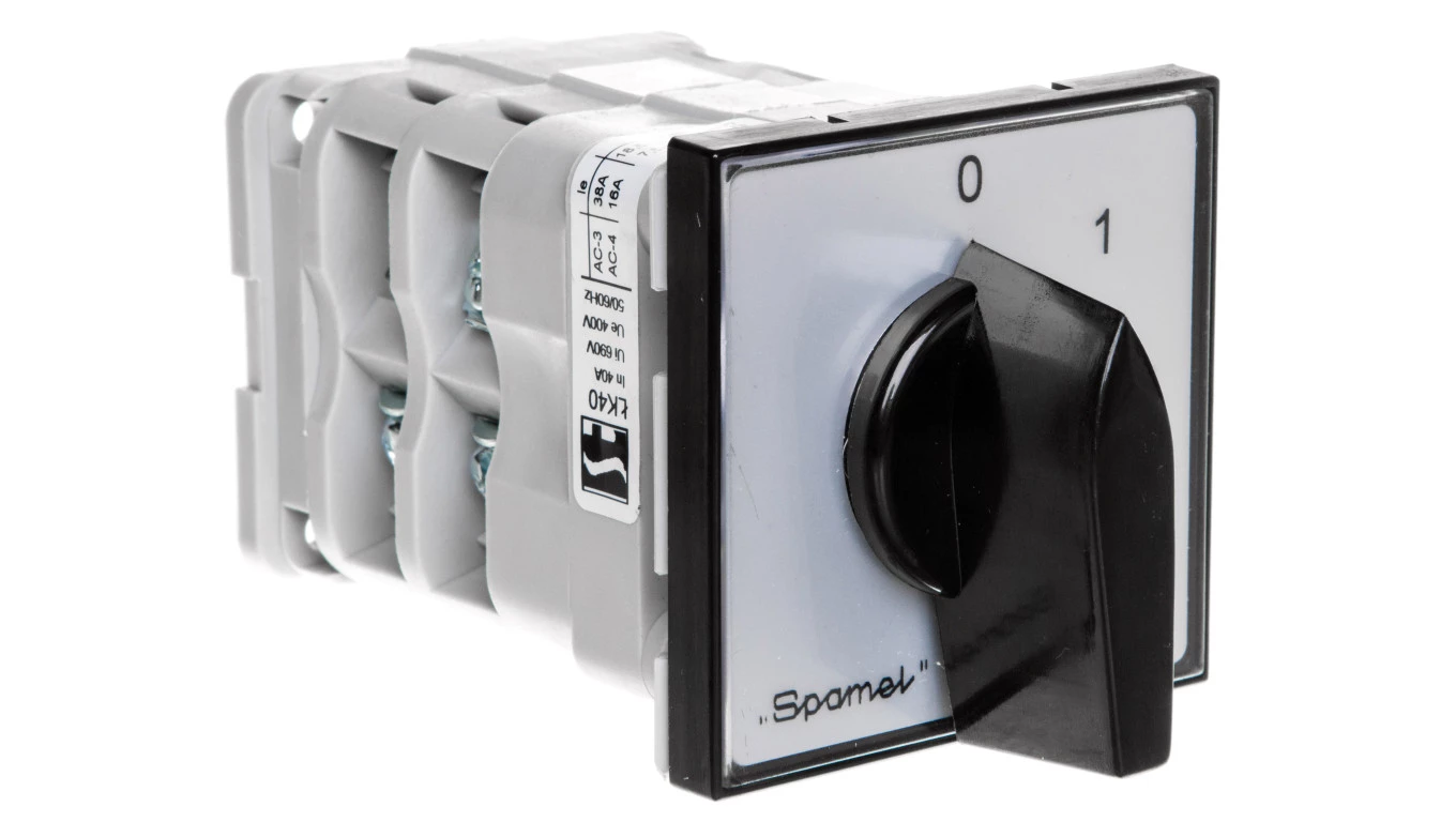 Łącznik Krzywkowy 40A, Łącznik obwodów 0-1-2-3, mocowany do pulpitu czoło szare pokrętło czarne o numerze katalogowym ŁK40-2.8445\P03 w kategorii Wyłączniki i rozłączniki obrotowe, Wyłączniki, rozłączniki. Produkt wyprodukowany przez markę SPAMEL.
