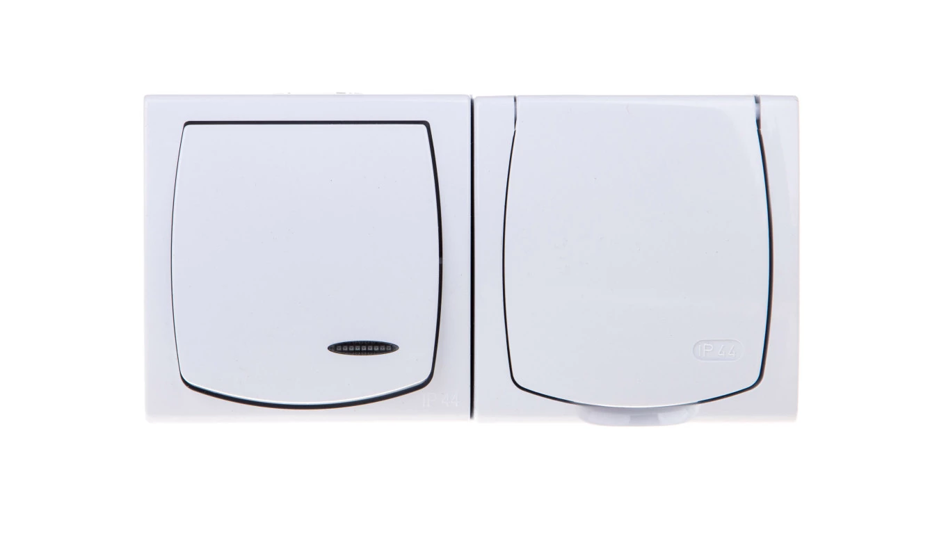 MADERA Łącznik hermetyczny pojedynczy z podświetleniem + gniazdo hermetyczne pojedyncze z/u z klapką biały ZH-NŁ1SG/00/w