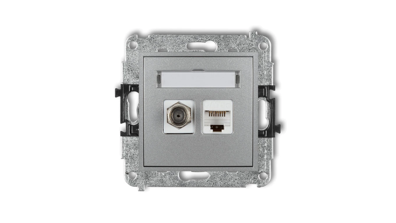 MINI Mechanizm gniazda antenowego poj. typu F (SAT) + gniazda komp. poj. 1xRJ45, kat. 6, 8-stykowy srebrny metalik 7MGFK-3