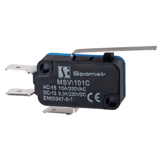 Łącznik miniaturowy dźwignia płaska długa o numerze katalogowym MSV\101C w kategorii Krańcówki, Czujniki mechaniczne. Produkt wyprodukowany przez markę SPAMEL, seria MSV.