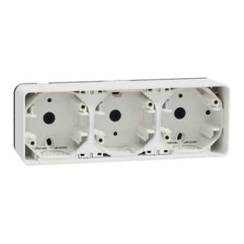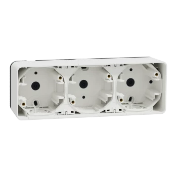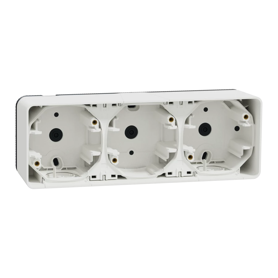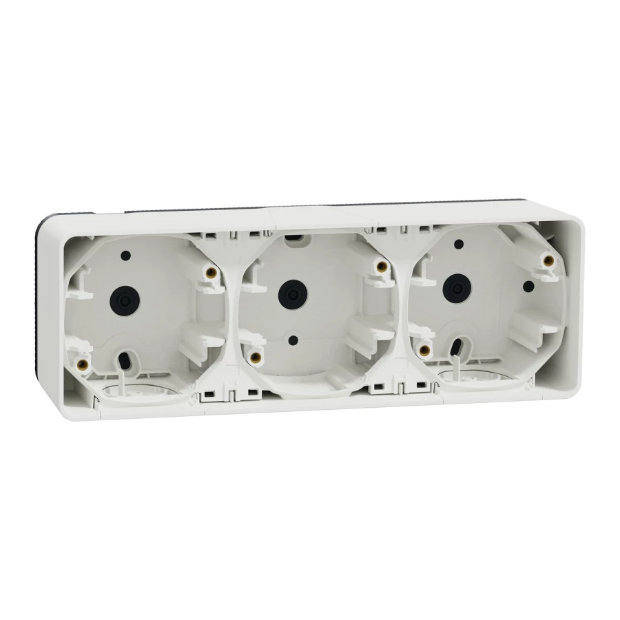 Mureva podstawa naścienna trzykrotna pozioma kolor biały o numerze katalogowym MUR39913 w kategorii Puszki natynkowe, Puszki instalacyjne. Produkt wyprodukowany przez markę SCHNEIDER ELECTRIC, seria MUREWA.