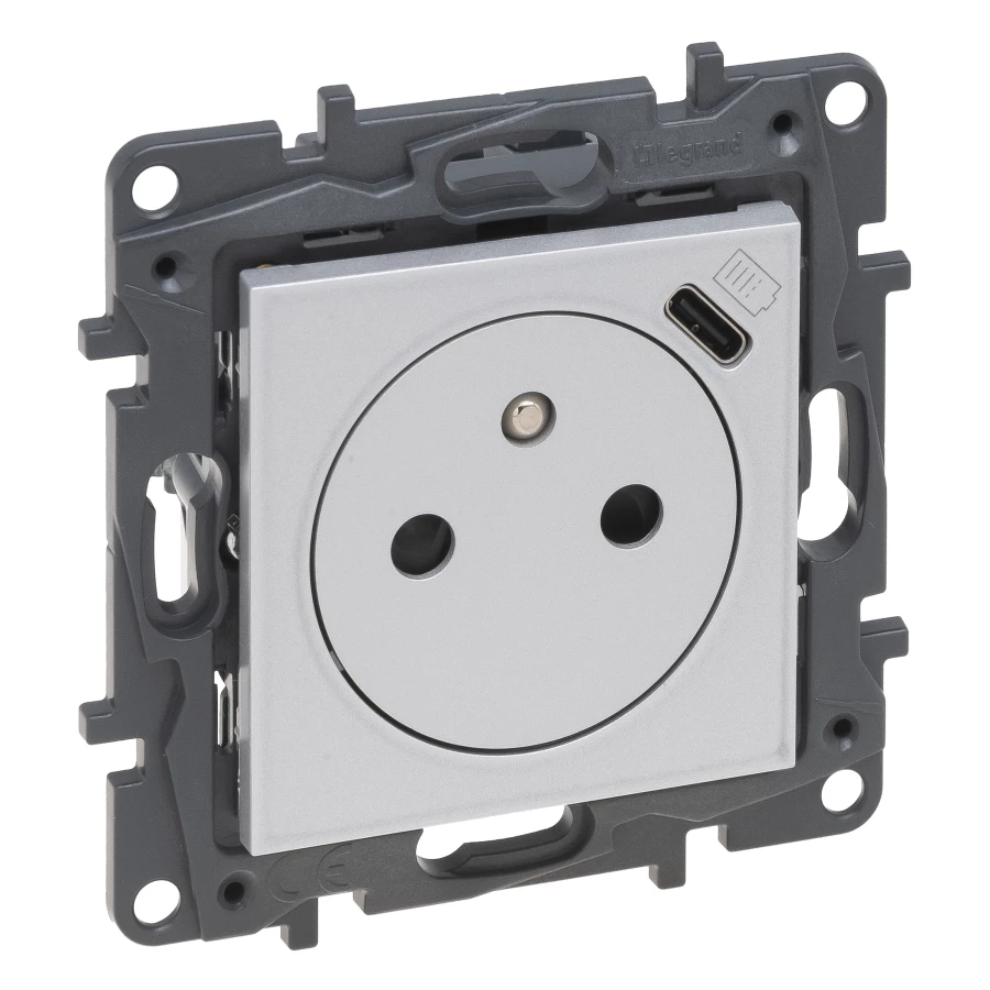 Gniazdo zasilające pojedyncze z uziemieniem z USB typu C umieszczonym w plakietce, zaciski automatyczne, z przesłoną- kolor aluminium, NILOE STEP o numerze katalogowym 863338 w kategorii Gniazda podtynkowe, Gniazda instalacyjne. Produkt wyprodukowany przez markę LEGRAND, seria NSTEP.