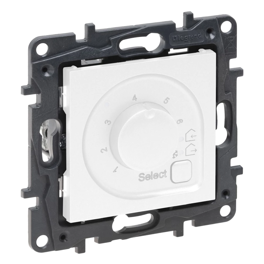 Termostat podłogowy - kolor biały, NILOE STEP o numerze katalogowym 863142 w kategorii Osprzęt analogowy, Regulatory, termostaty, programatory. Produkt wyprodukowany przez markę LEGRAND, seria NSTEP.