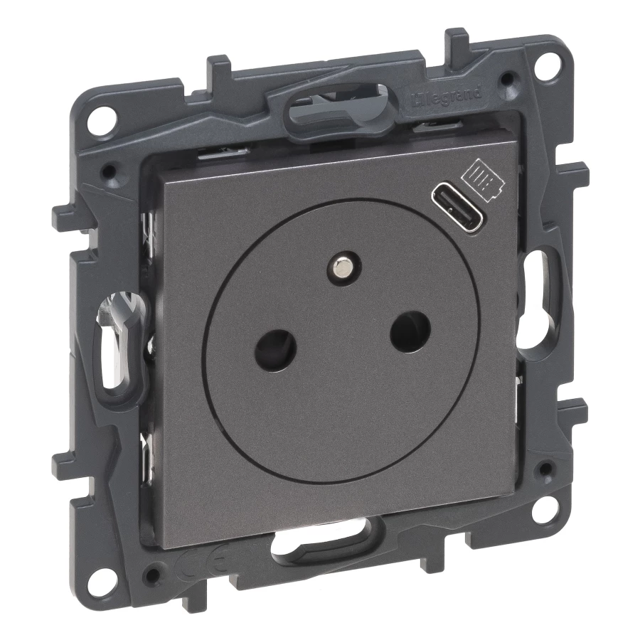 NILOE STEP MODUŁ STAL GNIAZDO 1X Z/U Z PRZESŁONAMI ZACISKI SPRĘŻYNOWE+ ŁADOWARKA USB TYP C 1.5A