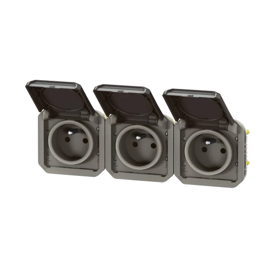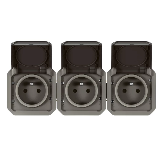 Gniazdo potrójne z uziemieniem 3x2P+Z, poziome, mechanizm 16 A - 250 V~- antracyt, NOWE PLEXO 55 o numerze katalogowym   069844L w kategorii Gniazda podtynkowe>Gniazda natynkowe. Produkt wyprodukowany przez markę LEGRAND, seria NOWE PLEXO55.