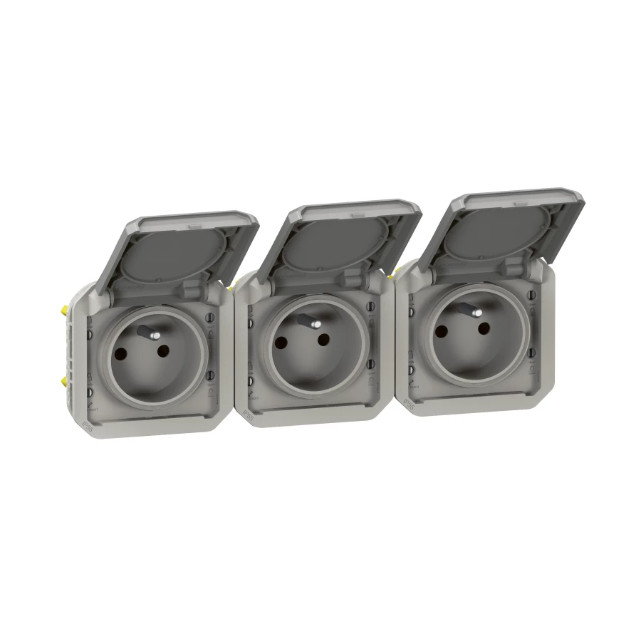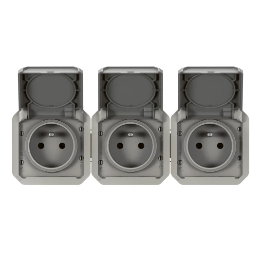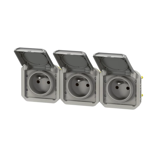 Gniazdo potrójne z uziemieniem 3x2P+Z, poziome, mechanizm 16A-250V~- szare, NOWE PLEXO 55 o numerze katalogowym   069564L w kategorii Gniazda podtynkowe>Gniazda natynkowe. Produkt wyprodukowany przez markę LEGRAND, seria NOWE PLEXO55.
