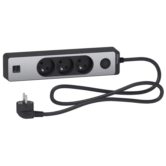 Odace Przedłużacz 3 gniazdowy z łącznikiem 2x USB, 1,5m antracyt+szczotkowane aluminium ST933U1BA