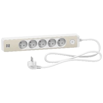 Odace Przedłużacz 5 gniazdowy z łącznikiem 2x USB, 1,5m biały+szczotkowany brąz ST935U1WB