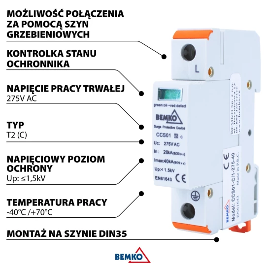 Ogranicznik przepięć 1P 20kA(8/20) KLASA T2 C A50-CCS01-1P-C