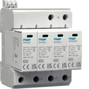 Ogranicznik przepięć T1+T2 MOV 4P sieć TN-S/TT Iimp=50 kA In=50kA Up1, 2kV o numerze katalogowym SPA931 w kategorii Ograniczniki przepięć typ 1+2, Ograniczniki przepięć. Produkt wyprodukowany przez markę HAGER.
