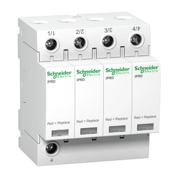 Ogranicznik przepięć iPRD65r-T2-4 4-biegunowy Typ2 65 kA ze stykiem o numerze katalogowym A9L65401 w kategorii Ograniczniki przepięć typ 2, Ograniczniki przepięć. Produkt wyprodukowany przez markę SCHNEIDER ELECTRIC, seria ACTI 9.