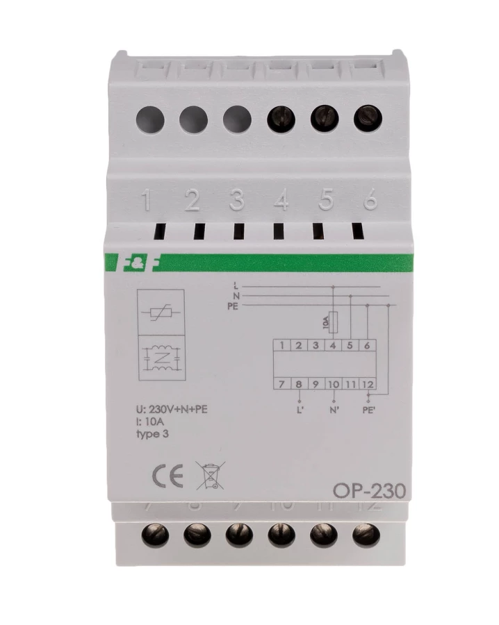 Ochronnik przeciwprzepięciowy OP-230 klasy D z filtrem przeciwzakłóceniowym Un=230V Imax=10A o numerze katalogowym OP-230 w kategorii Czujniki i sondy, Aparatura sterująca. Produkt wyprodukowany przez markę F&F.