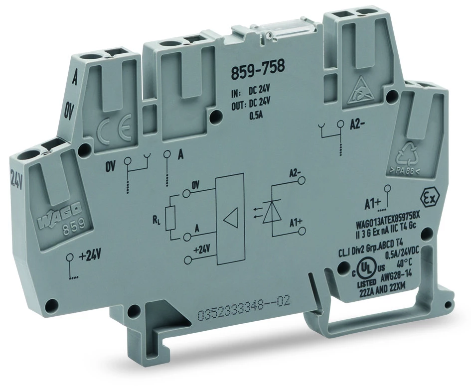 optoseparator; znamionowe napięcie wejściowe 24 V DC; zakres napięcia wyjściowego 6 … 30 V DC; maksymalny prąd długotrwały 1 A; podłączanie 3-przewodowe/załączanie potencjałem wysokim; częstotliwość 20 kHz; sygnalizacja statusu czerwony; szerokość 6 mm; szary