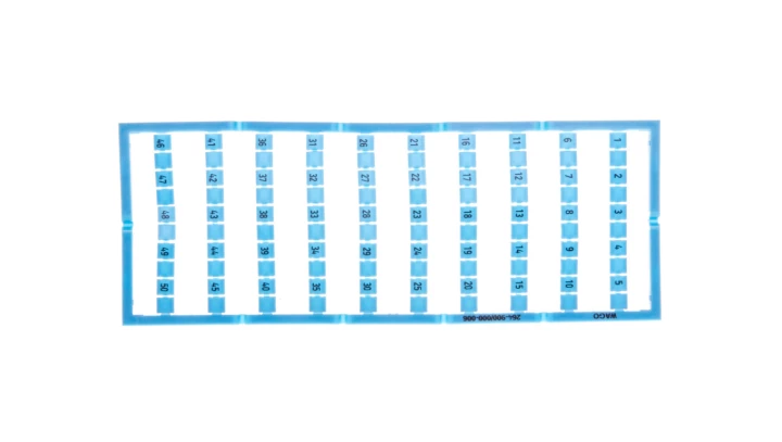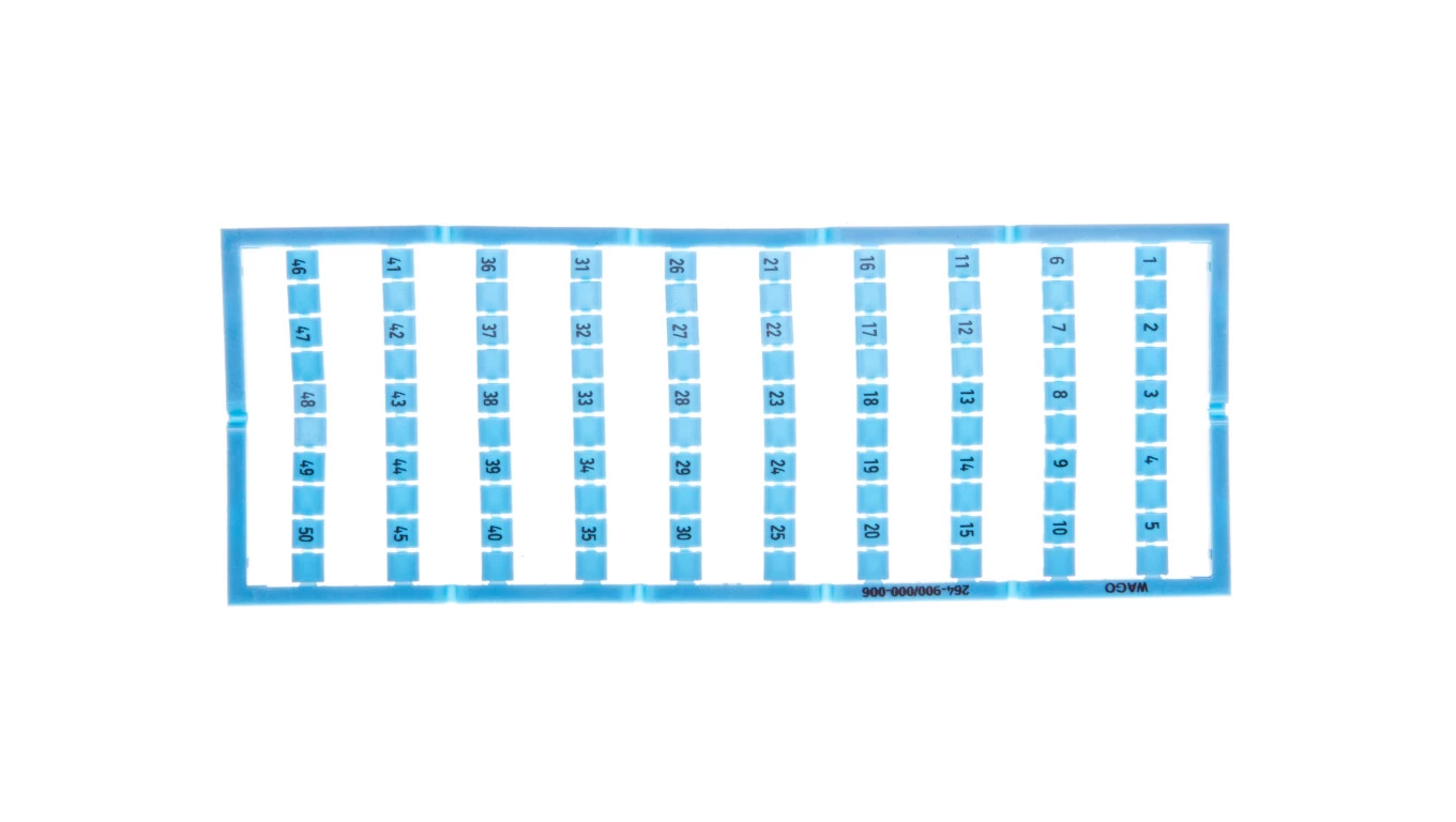 oznaczniki Mini-WSB; jako karta; z nadrukiem; 1, , 2, , 3, , 4, , 5, do 46, , 47, , 48, , 49, , 50, ; (po 1x); nierozciągalne; nadruk poziomo; do montażu zatrzaskowego; niebieski