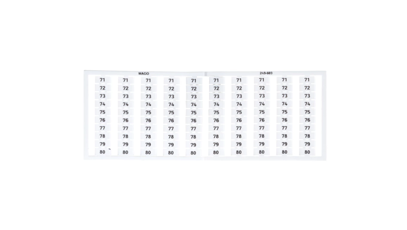 mata oznacznikowa WSB; jako karta; z nadrukiem; 71 ... 80 (10x); nierozciągalne; nadruk pionowo; do montażu zatrzaskowego; biały
