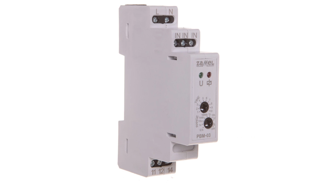 Przekaźnik bistabilny z wyłącznikiem czasowym 230V AC Typ: PBM-03 o numerze katalogowym EXT10000065 w kategorii Przekaźniki impulsowe, Przekaźniki. Produkt wyprodukowany przez markę ZAMEL, seria EXTA.