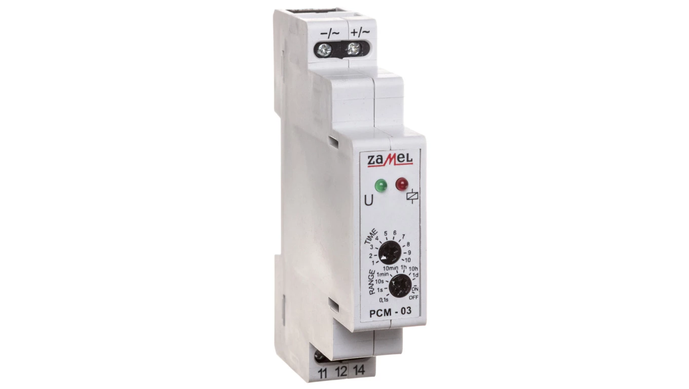 Przekaźnik czasowy 24V AC/DC Typ: PCM-03/24V o numerze katalogowym EXT10000079 w kategorii Przekaźniki czasowe, Przekaźniki. Produkt wyprodukowany przez markę ZAMEL, seria EXTA.