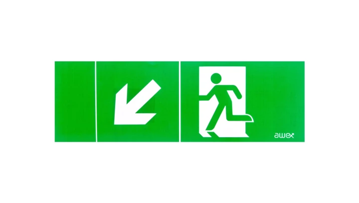 Piktogram KIERUNEK DO WYJŚCIA EWAKUACYJNEGO W DÓŁ W LEWO, 100x300mm o numerze katalogowym 5901821295444 w kategorii Piktogramy, Oprawy awaryjne. Produkt wyprodukowany przez markę AWEX.