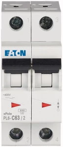 Wyłącznik nadprądowy 6kA PL6-C63/2 o numerze katalogowym 286573 w kategorii Wyłączniki nadprądowe 6kA, Wyłączniki nadprądowe. Produkt wyprodukowany przez markę EATON, seria PL6.