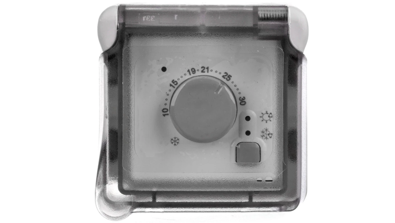 PLEXO55 MECHANIZM SZARY TERMOSTAT ELEKTRONICZNY POKOJOWY IP55 IK07 7-30ST C Z PRZYCISKIEM LATO/ZIMA
