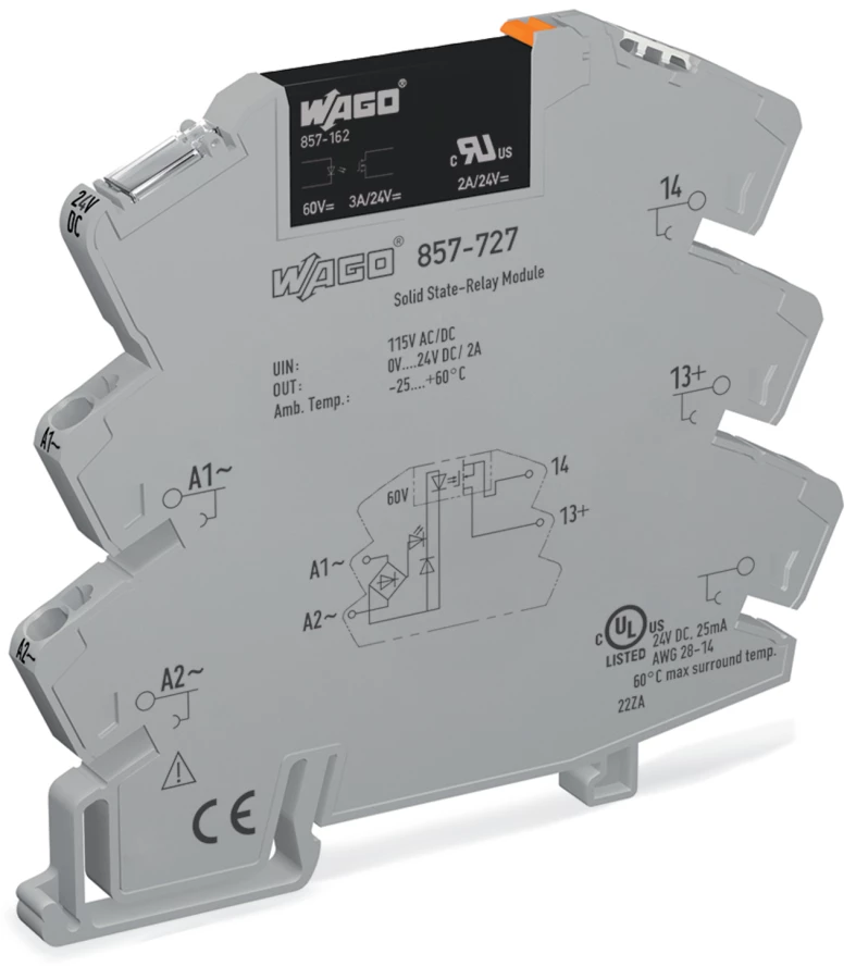 przekaźnik półprzewodnikowy; znamionowe napięcie wejściowe 115 V AC/DC; zakres napięcia wyjściowego 0 … 30 V DC; maksymalny prąd długotrwały 3 A; podłączanie 2-przewodowe; sygnalizacja statusu żółta; szerokość 6 mm; szary