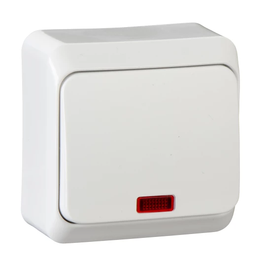 Łącznik natynkowy jednobiegunowy podświetlany, biały PRIMA o numerze katalogowym WDE001014 w kategorii Łączniki natynkowe jednobiegunowe, Łączniki jednobiegunowe. Produkt wyprodukowany przez markę SCHNEIDER ELECTRIC, seria PRIMA.