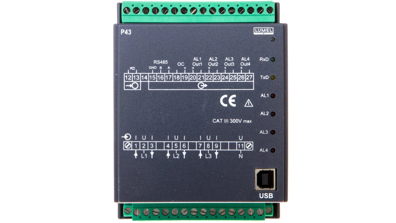 Programowalny przetwornik sieci 3-fazowej wejście I 5A wejście U 3x57,7/100V zasilanie 85-253V AC 90-320V DC wyjście 4 analog. P