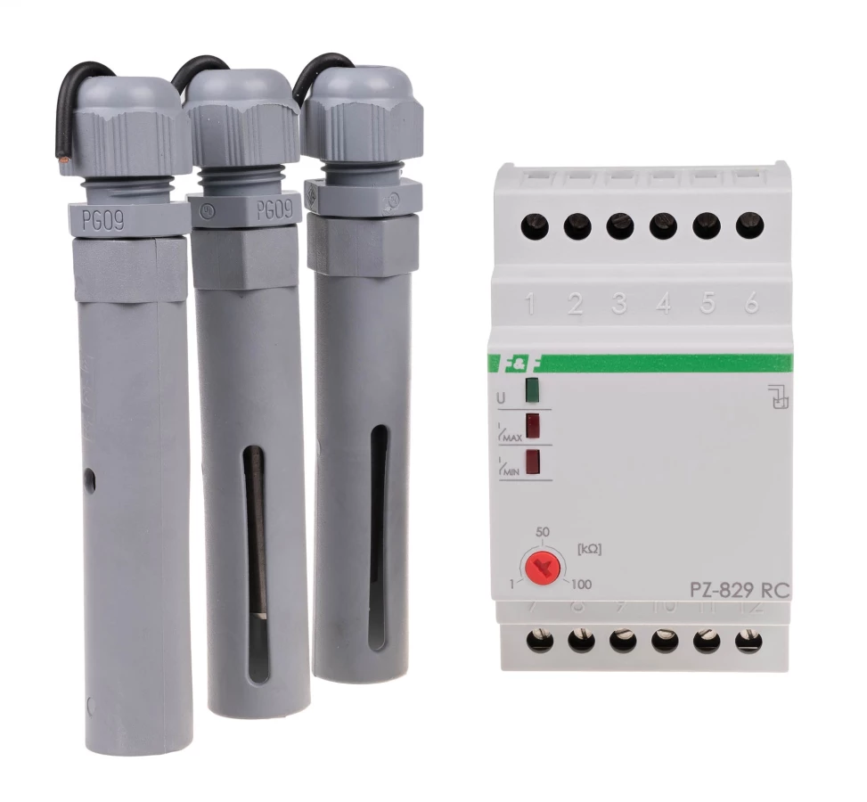 Przekaźnik kontroli poziomu cieczy PZ-829 RC dwustanowy, z regulacją czułości, z sondami PZ2 (3szt.), styki 2×1P, I=2×16A, 3 moduły o numerze katalogowym PZ-829RC w kategorii Przekaźniki kontrolne, Przekaźniki. Produkt wyprodukowany przez markę F&F.