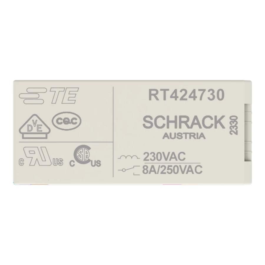przekaźnik bazowy; znamionowe napięcie wejściowe 230 V AC; 2 x zestyk przełączny; maksymalny prąd długotrwały 8 A; szerokość 13 mm; wysokość 15 mm