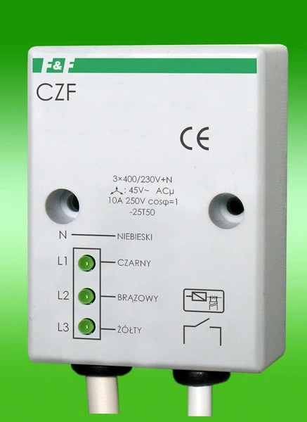 Czujnik zaniku i fazy CZF styk: 1Z , I=10A, obudowa hermetyczna , przewód przyłączeniowy o numerze katalogowym CZF w kategorii Przekaźniki kontrolne, Przekaźniki. Produkt wyprodukowany przez markę F&F.