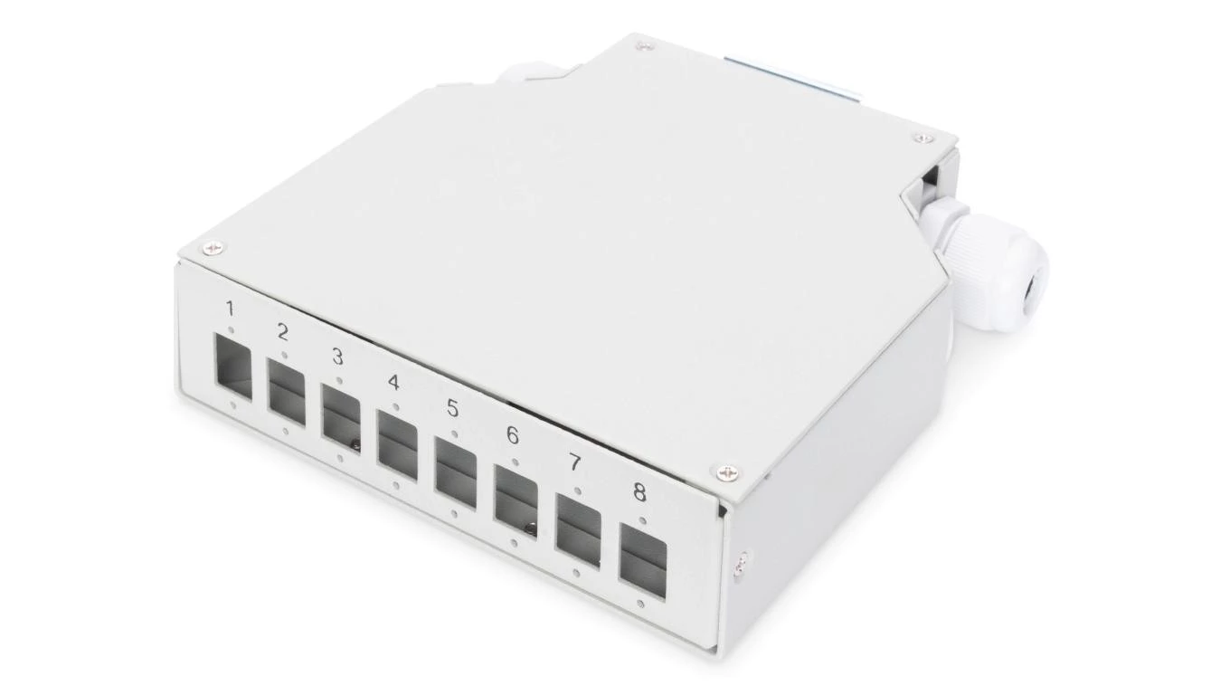 Przełącznica światłowodowa na szynę DIN, 8x LC duplex z tacką na spawy, szary DN-96891