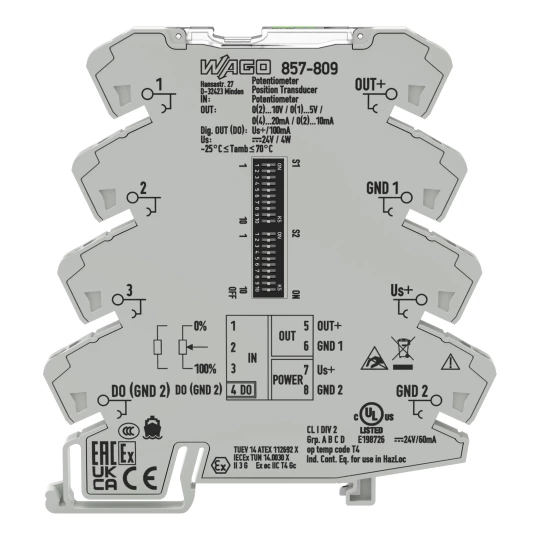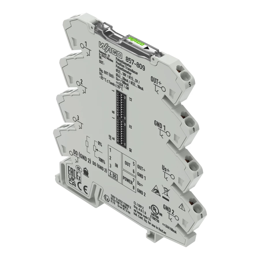 przetwornik pomiarowy do potencjometrów; prądowy i napięciowy sygnał wyjściowy; moduł wyjść dwustanowych; konfiguracja przy użyciu oprogramowania; napięcie zasilania 24 V DC; szerokość 6 mm; 2,50 mm²