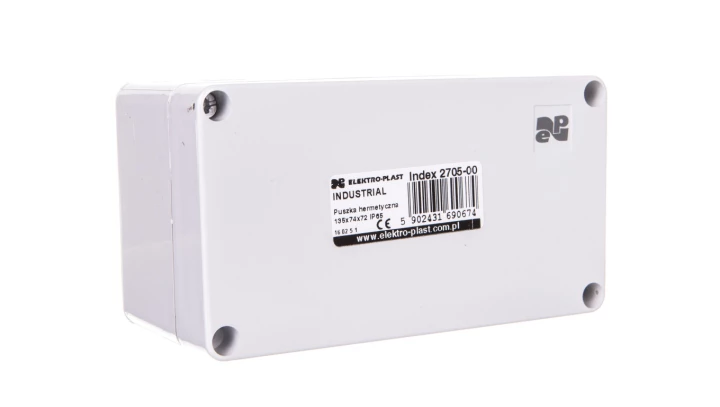 Puszka natynkowa 135x74x72 IP65 INDUSTRIAL o numerze katalogowym 2705-00 w kategorii Puszki natynkowe, Puszki instalacyjne. Produkt wyprodukowany przez markę ELEKTRO-PLAST NASIELSK, seria INDUSTRIAL IP65.