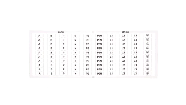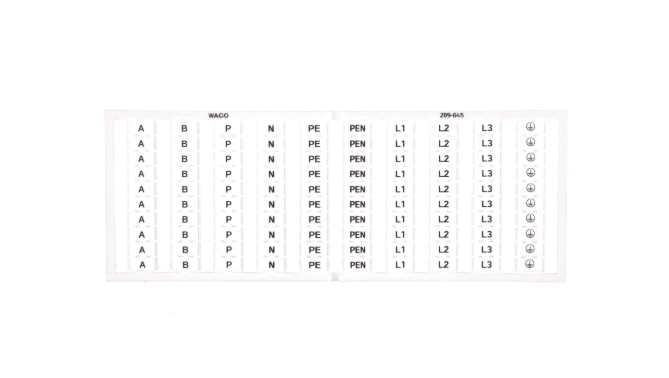 mata oznacznikowa WSB; jako karta; z nadrukiem; A, B, P, N, PE, PEN, L1, L2, L3, uziemienie (10x); nierozciągalne; nadruk pionowo; do montażu zatrzaskowego; biały