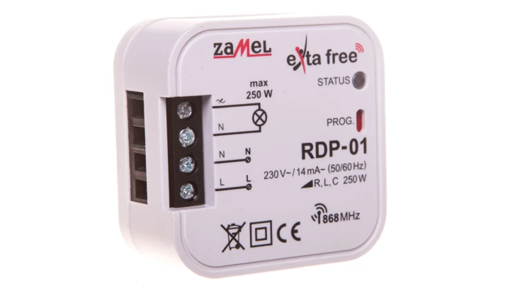 Radiowy ściemniacz dopuszkowy 1-kanałowy Typ: RDP-01 o numerze katalogowym EXF10000021 w kategorii Przekaźniki - pozostałe, Przekaźniki. Produkt wyprodukowany przez markę ZAMEL, seria EXTA FREE.