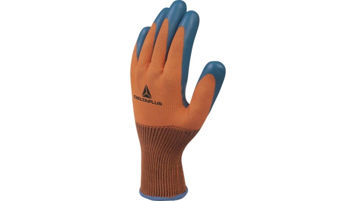 Rękawice dziane z poliestru, dłoń powlekana lateksem pure, ścieg 13 pomarańczowo-niebieski 10 o numerze katalogowym VE733OR10 w kategorii Rękawice poliestrowe i poliamidowe, Ochrona rąk. Produkt wyprodukowany przez markę DELTA PLUS.