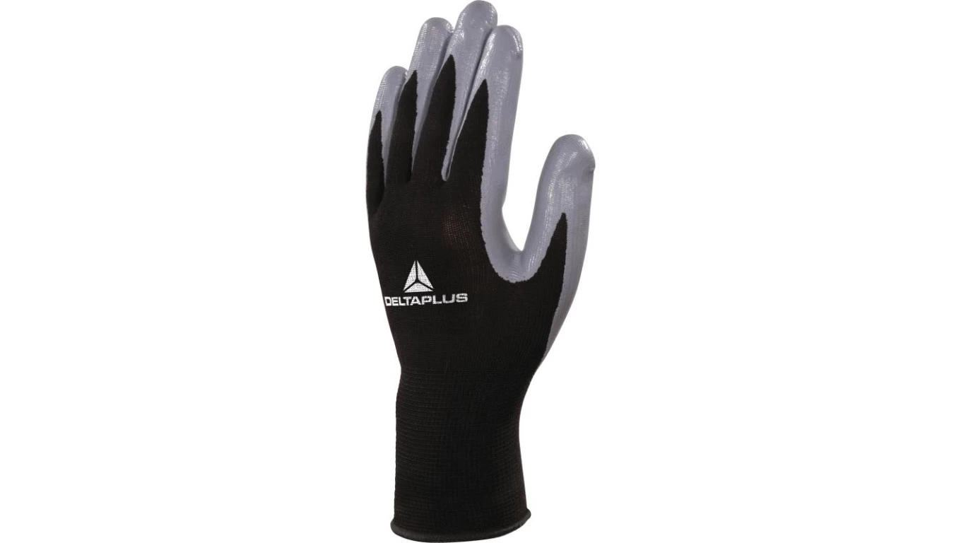 Rękawice dziane z poliestru (100%), dłoń powlekana Nitrylem, ścieg 13 czarno-szary 8 o numerze katalogowym VE712GR08 w kategorii Rękawice poliestrowe i poliamidowe, Ochrona rąk. Produkt wyprodukowany przez markę DELTA PLUS, seria VE712GR.