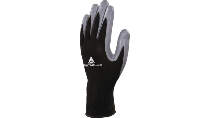 Rękawice dziane z poliestru (100%), dłoń powlekana Nitrylem, ścieg 13 czarno-szary 7 o numerze katalogowym VE712GR07 w kategorii Rękawice poliestrowe i poliamidowe, Ochrona rąk. Produkt wyprodukowany przez markę DELTA PLUS, seria VE712GR.