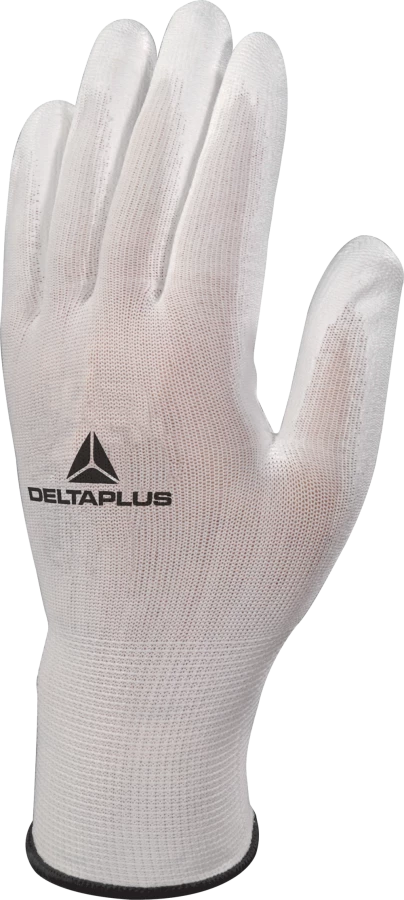 Rękawice dziane z poliestru (100%), dłoń powlekana poliuretanem, ścieg 13 biały 10 o numerze katalogowym VE702P10 w kategorii Rękawice poliestrowe i poliamidowe, Ochrona rąk. Produkt wyprodukowany przez markę DELTA PLUS, seria VE702P.